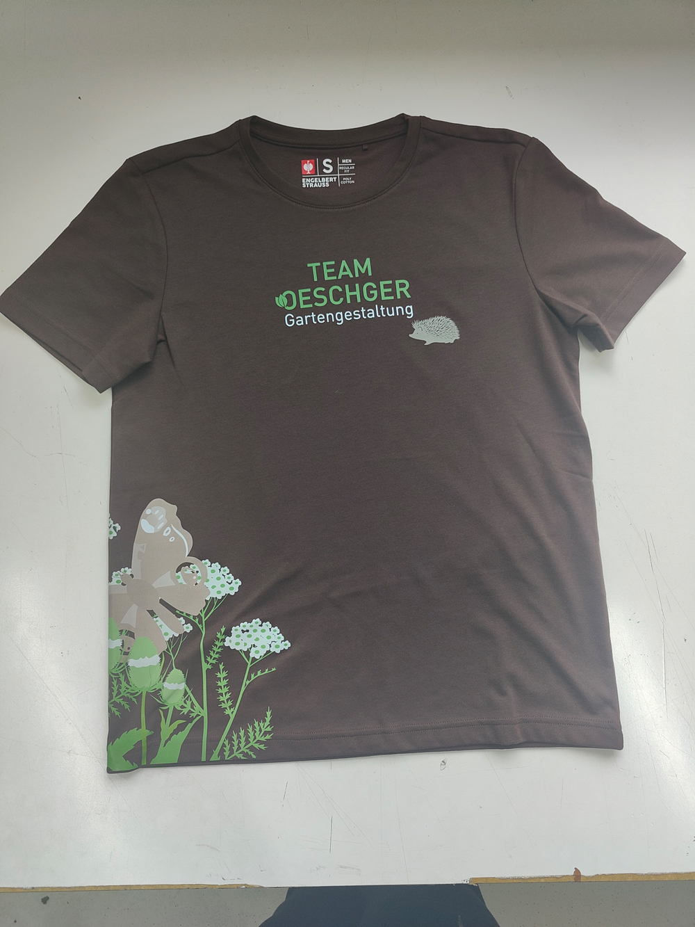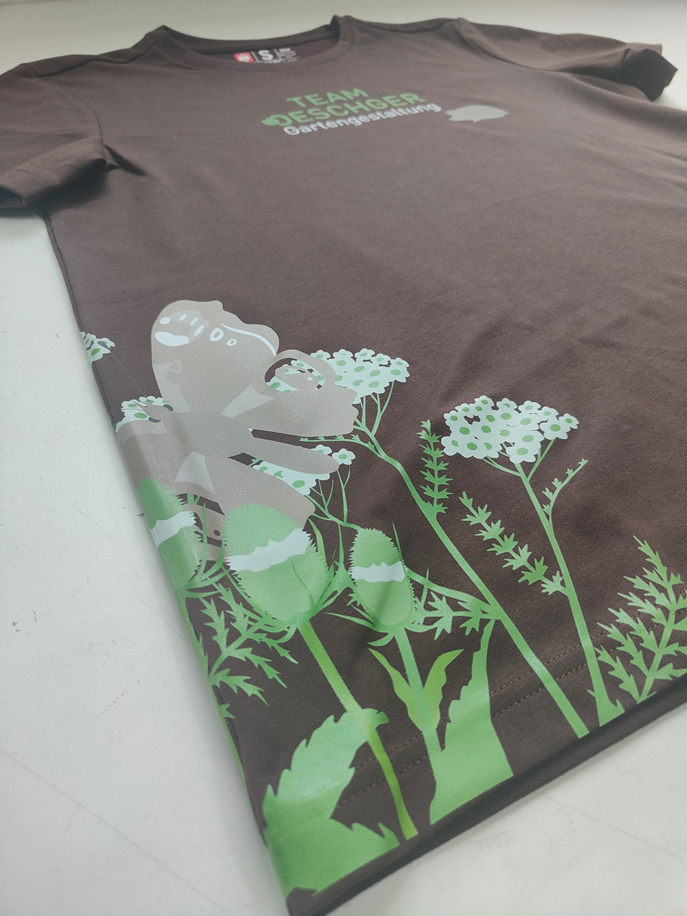 Für die Oeschger Gartengestaltung durften wir stylische Shirts für die Handwerkerolympiade produzieren - jedes mit drei verschiedenen, detailreichen Motiven, inklusive Blumenwiesen-Design quer über die Seitennaht. Mit DTF-Druck? Kein Problem!